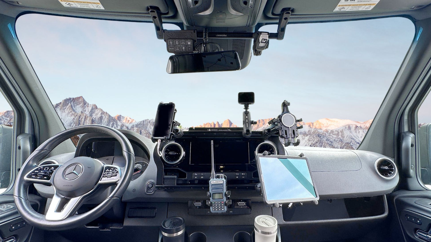 A no drill dash solution to securely and conveniently mount all of your navigation devices in your Mercedes Sprinter and Ford Transit